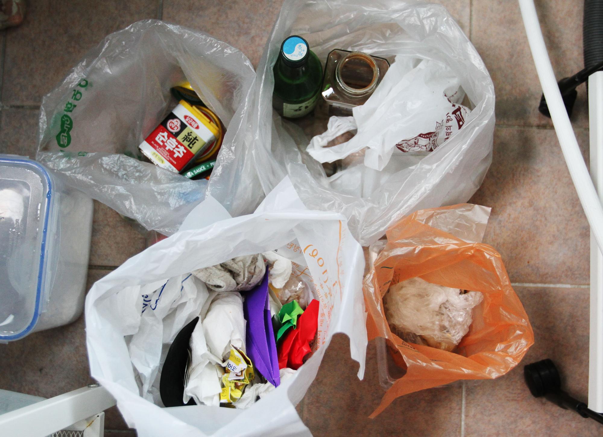 2014年6月4日,在韩国首尔,主妇金莲心的家里摆放着四袋不同种类的垃圾。新华社记者姚琪琳摄